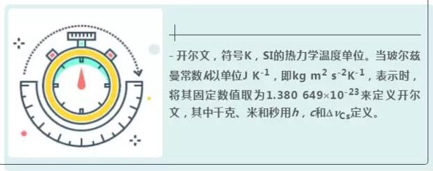 - 開爾文,符號K,SI的熱力學(xué)溫度單位。當玻爾茲曼常數(shù)k以單位J K-1,即kg m2 s-2K-1,表示時,將其固定數(shù)值取為1.380 649′10-23來定義開爾文,其中千克、米和秒用h,c和DnCs定義。
